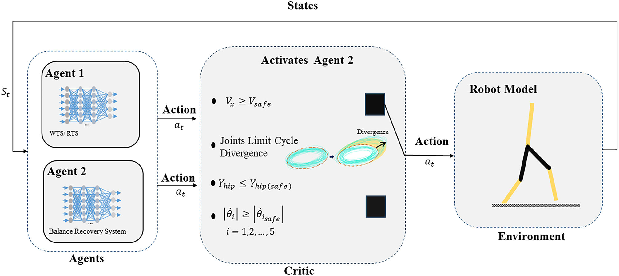 Developed a multi-agent deep reinforcement learning framework for robust bipedal robot locomotion. The system combines two agents: one for walking/running control and another for balance recovery, enabling stable locomotion even under disturbances.