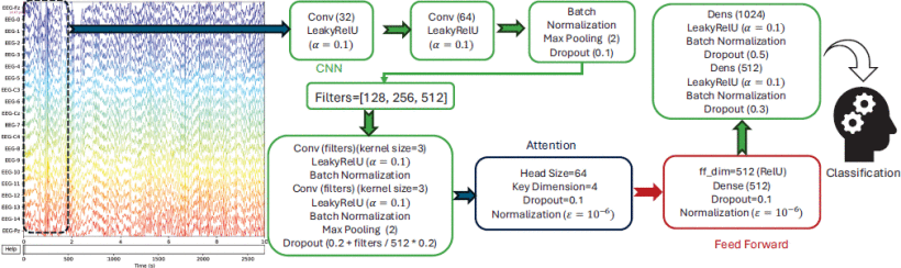 Developed an integrated transformer-CNN architecture for classifying EEG motor imagery signals. The model combines convolutional neural networks for feature extraction with transformer attention mechanisms for improved classification accuracy in assistive technology applications.